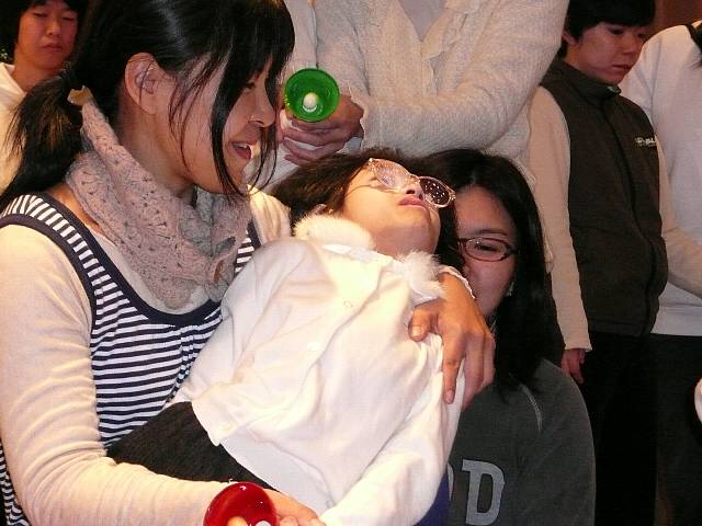 本番のハンドベルではこれ以上開かないぐらいお目々を開けて精一杯頑張りました。終わった後も興奮は冷めやらず、少し離れた場所から見ているのにお目々はギンギンです。こんな状態で寝られるお姉ちゃんが信じられない成ちゃんです。それが影響したのか午後に泣きだしたようで電話がありましたがなんとか様子を見ながらなだめていただいたようです。電話でママの声を聞いたら少し落ち着ける成ちゃんなので、ママは急遽自分の声をテープに録音して持参いたしました。