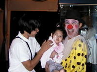 なにが緊張かというと 集合時間の9時20分に間に合うかどうかが大変な問題だからです。 昨日から私の頭の中は今日の朝の段取りでいっぱい。まぁその甲斐あってなんとか間に合いみんなと一緒にバスに乗って出発することができました。 行き先は「京都嵐山オルゴール博物館」でした。成ちゃんの付き添いとして私も同行しました。 中にはいるといくつかの大きなオルゴールが恭しく並べられ 静かな博物館の中で 優しい声のお兄さんがヨーロッパのオルゴールをいくつか見せながら説明してくださいました。大きなジュークボックスのようなオルゴール、可愛いからくり人形のオルゴール、元気な音の出るストリートオルガン。どれもこれも100年から200年も前の貴重なコレクションです。 オルゴールの奏でるたおやかな音色は 私たちの耳や体にスーッととけ込むようなとても優しいものでした。 成ちゃんも 音に敏感なお友達も、みんな心地よくその音色を楽しんでいました。思わずその心地よさが表情に表れていました。 最後にパフォーマンスを見せてくれたピエロさんと成ちゃん、記念撮影!