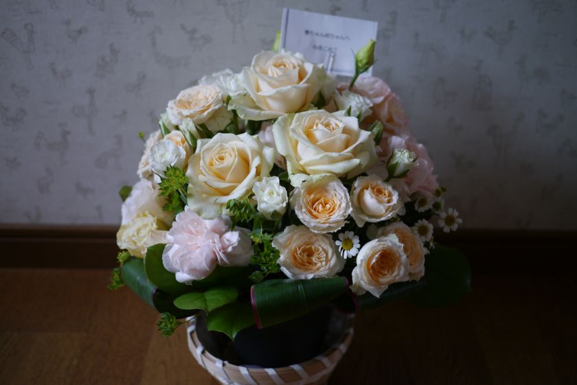 やわらかなクリーム色のバラやトルコキキョウ、などをメインとしたアレンジでした。ふんわりとしたイメージのやわらかな色合いがとてもすてき。