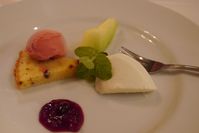 デザート盛り合わせ。 トマトのソルベがあっさりしていて、爽やかなお味でした。