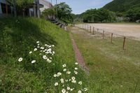 緑に囲まれたグランド。可愛い花があちこちにたくさん咲いていました。 今日はほんとに気持ちのいいお天気~。 鉄棒があって、子ども達はここで元気いっぱい遊んでたんですね・・。