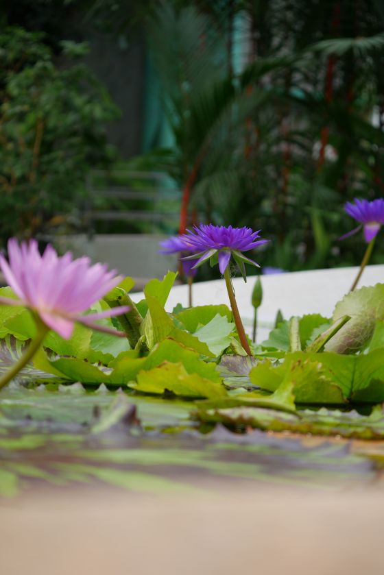 アトリウム(温室)の中は熱帯原産の水生植物を中心にたくさんの植物が展示されていました。 各種のスイレンが色爽やかに咲いていました。