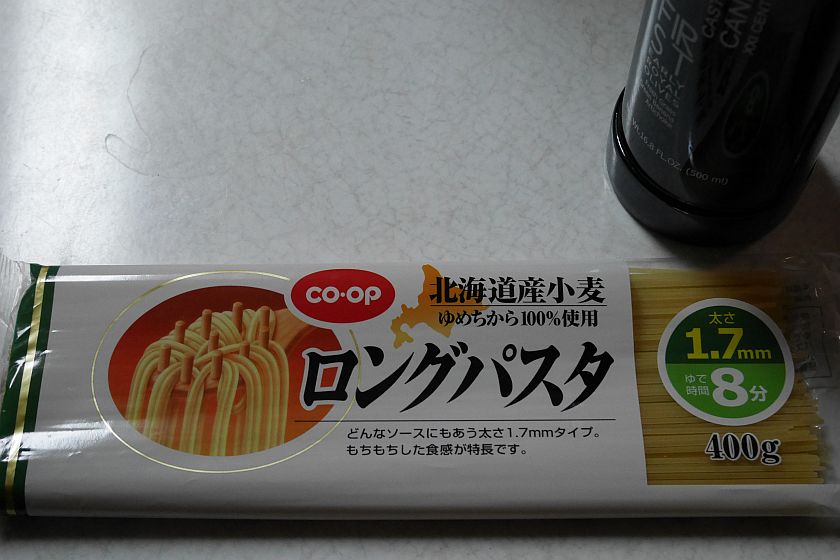 パスタは「北海道産小麦ゆめちから使用」というのを見つけたので買ってみたらこれがモチモチしていながら、団子っぽくならずとてもおいしかった。でも国産パスタはちょっとお高いね。
